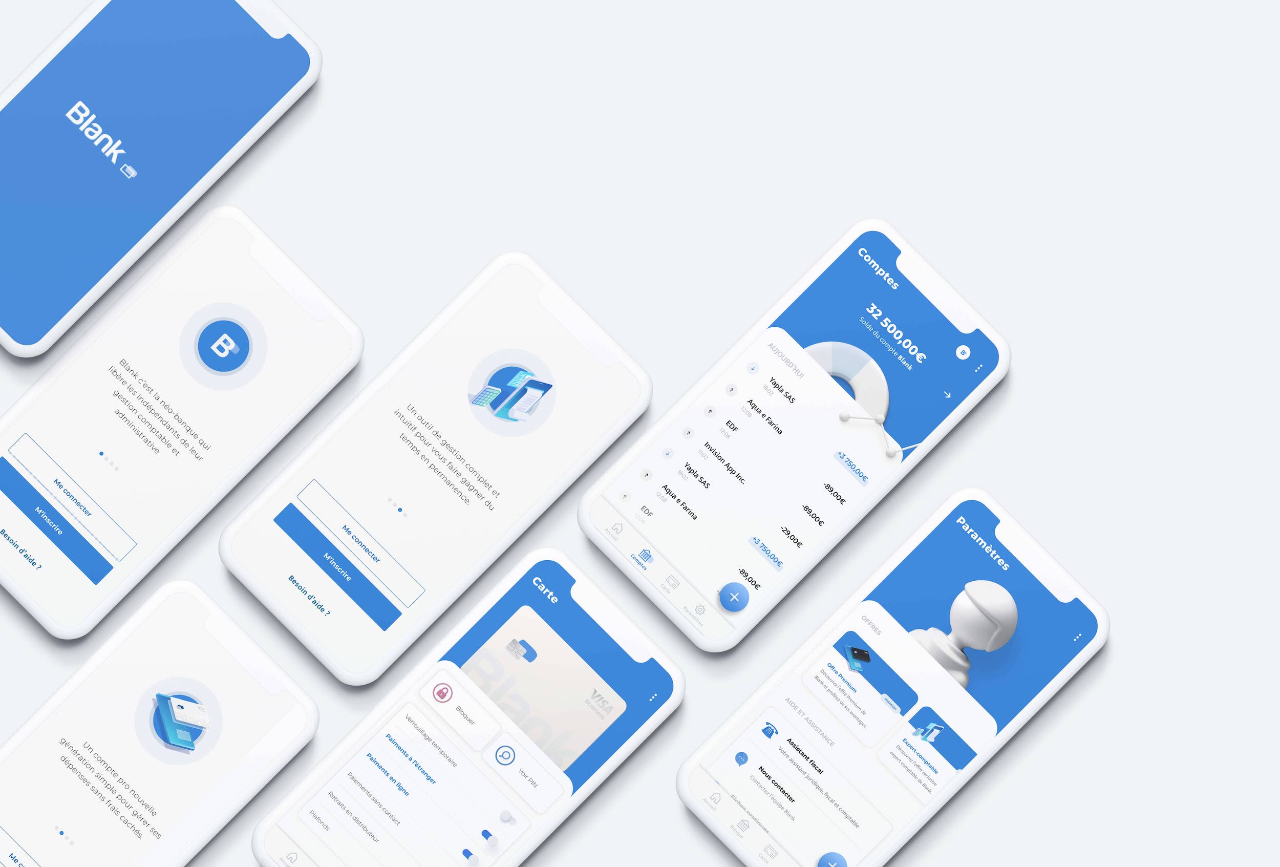 Blank was born within La Fabrique by CA, Le CrΓ©dit Agricole's startup studio. The founding team composed of the CEO, CTO, COO, lead developer and product owner wished to co-design the service and its bank with a freelance product designer, in order to better tackle the end users' needs. We thus joined the adventure for 7 months! After a first couple of months spent with the team on qualitative research, conducting interviews and collecting the user's insights, we listed their needs, prioritized them and drew the subsequent user stories from them. This led to the design of the app's user flows and wireframes.