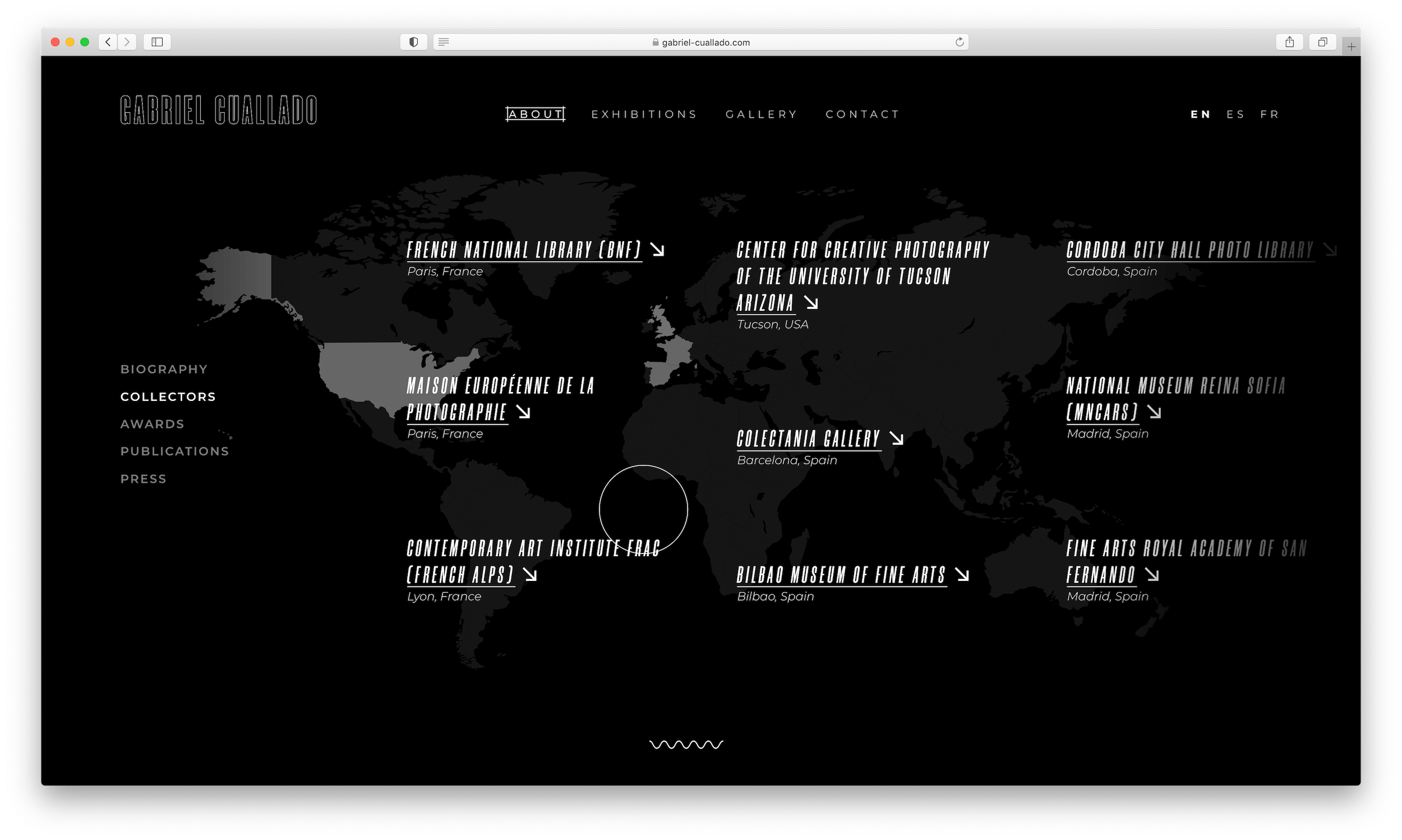 The goal was to find a minimalistic, elegant and modern way to showcase the photographer's pictures, exhibitions, collectors and publications. This had to be done in 3 languages and the family had to be made fully autonomous on the website's update.