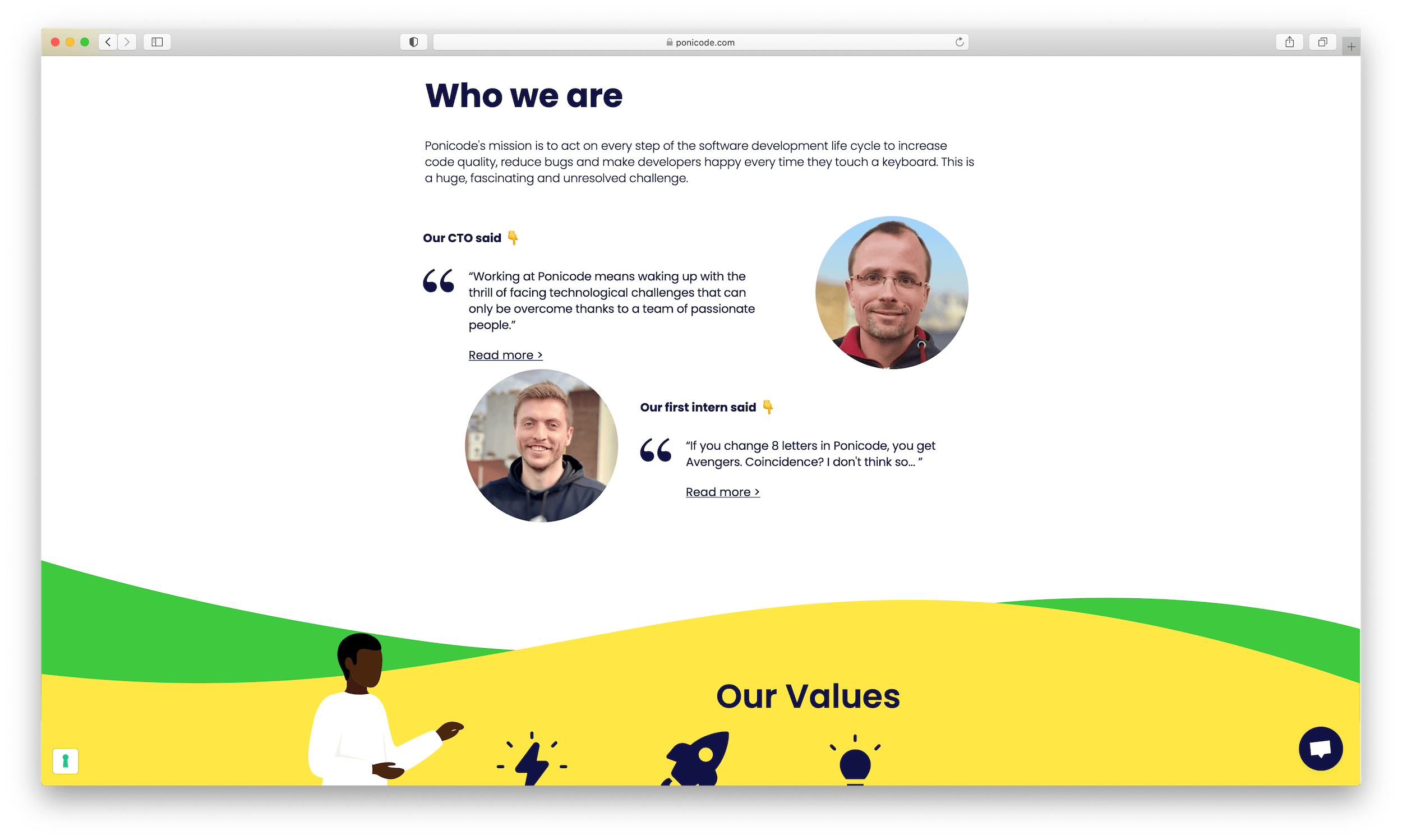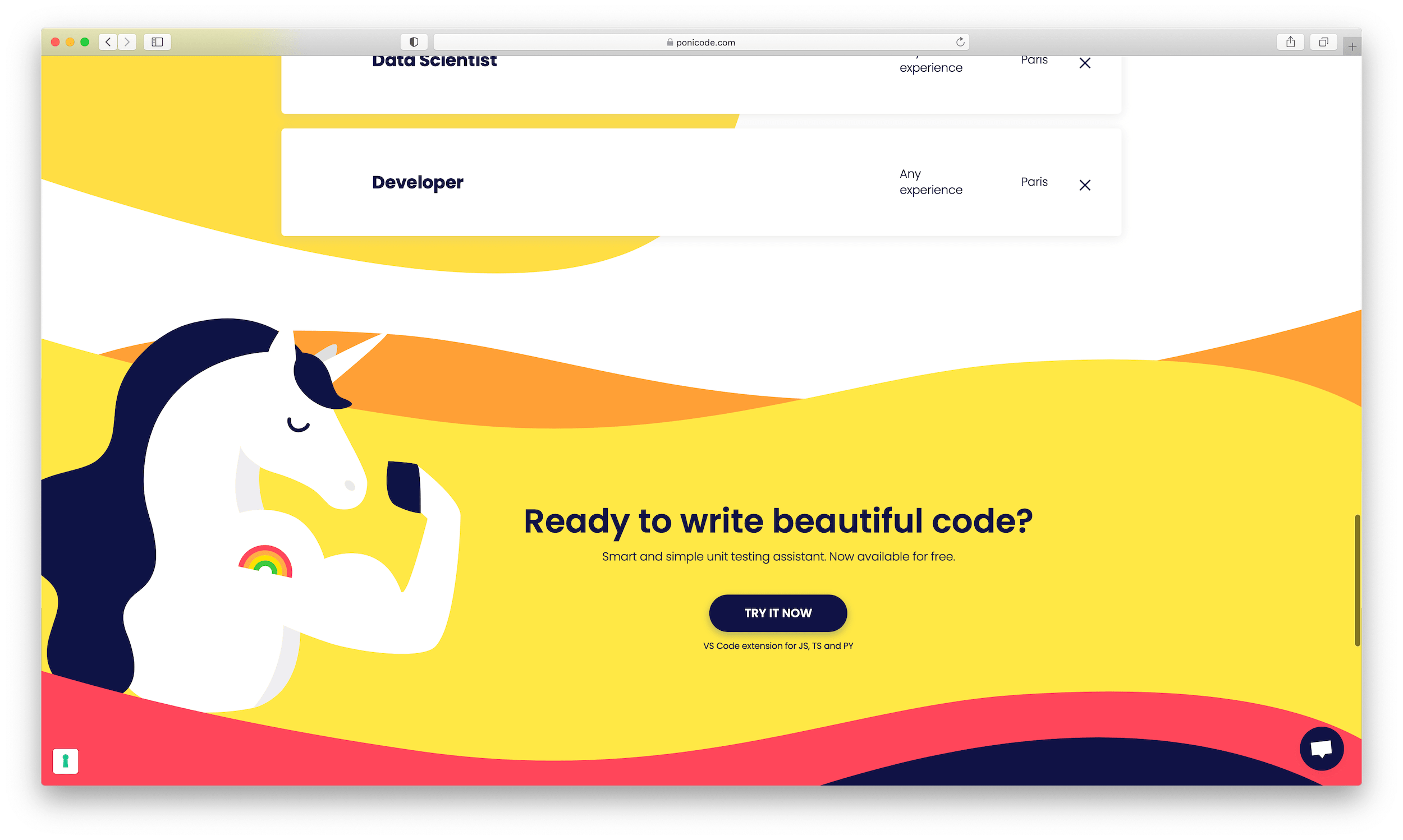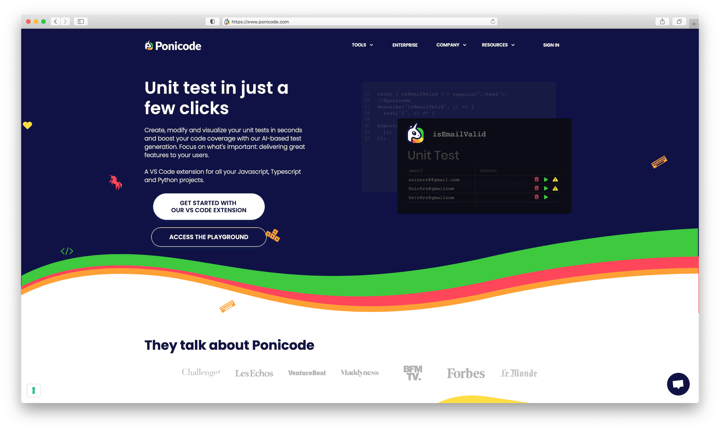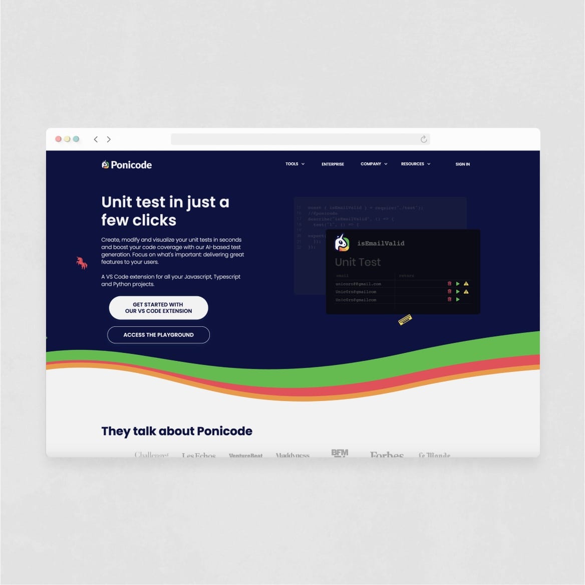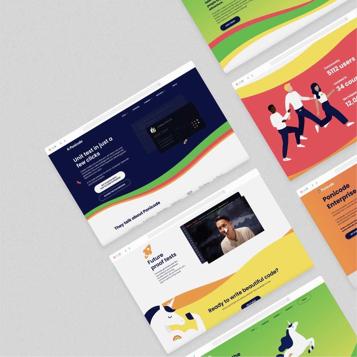 We doubled down on the "poney unicorn" and built the website in the image of the quick, magical and colorful experience that Ponicode's founders envisioned. Turning the website into a giant animated demo and including an extensive collection of ressources and documentation, we aimed at educating and encouraging coders to make unit tests a systematic part of their workflow.